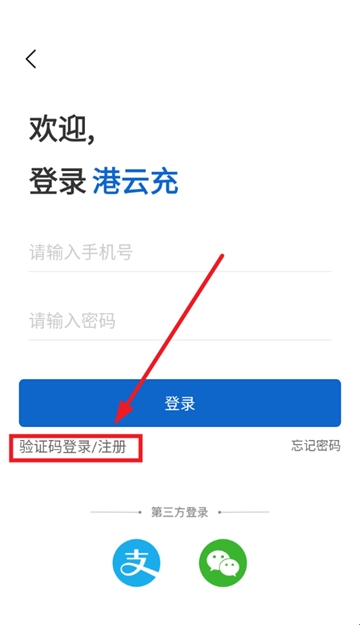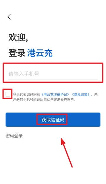 3、输入手机号,勾选登录代表您已同意《港云充注册协议》《隐私政策》,未注册的手机号验证后自动创建港云充账户,点击获取验证码注册登录即可。