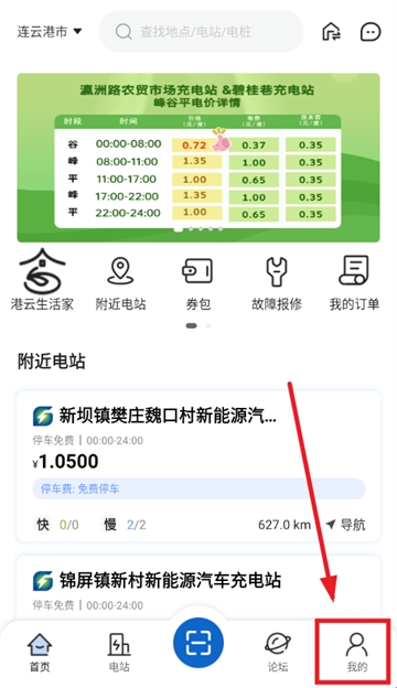 1、下载安装并打开港云充App,进入首页后点击我的。