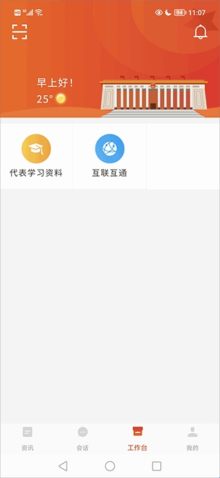 1、打开河南人大app,在软件的工作台页面找到并点击“互联互通”按键;