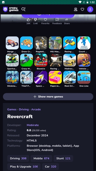 CrazyGames是一款拥有非常多游戏的资源软件,用户可以在CrazyGames里面找到任何你想玩的游戏。当你感到无聊时,你可以下载CrazyGames,直接在软件里众多的分类中寻找你喜欢的游戏。虽然软件自带很多游戏资源,但是不会占用手机的内存,用户可以自己选择心仪的游戏打开即玩,快下载试试看吧!