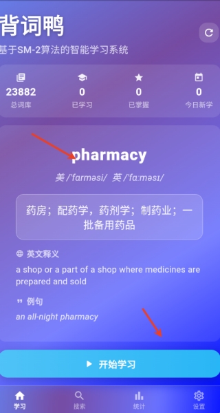 1、点击开始学习,系统每天会给大家带来一些不同的单词记忆训练。