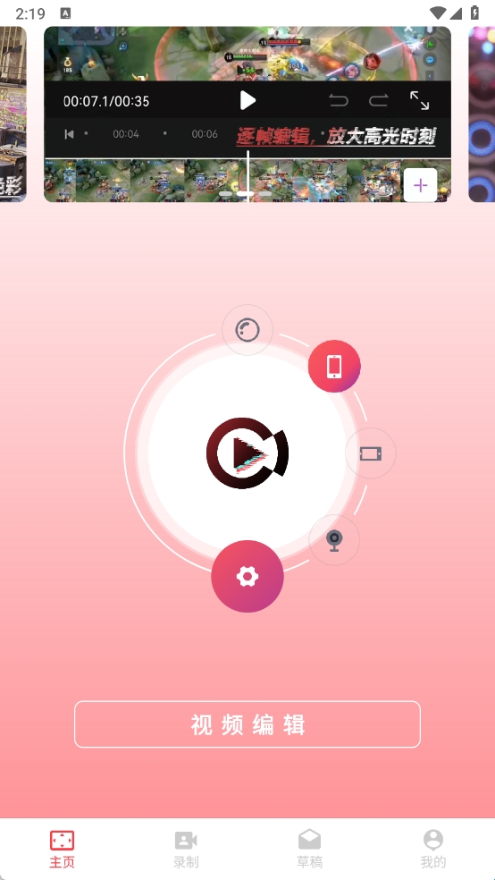 3、进入软件,可以看见有主页、录制、草稿、我的四个功能板块内容。