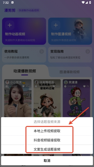 2、选择话题音频来源,有从本地上传视频提取、抖音视频链接提取、文案生成话题音频功能。