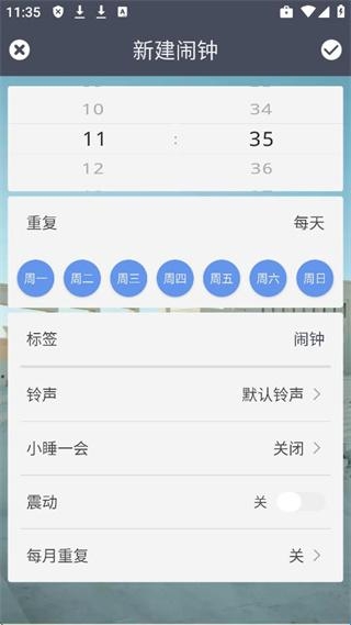3、详细设置闹钟时间、重复周期等参数后,点击顶部对勾保存设置。