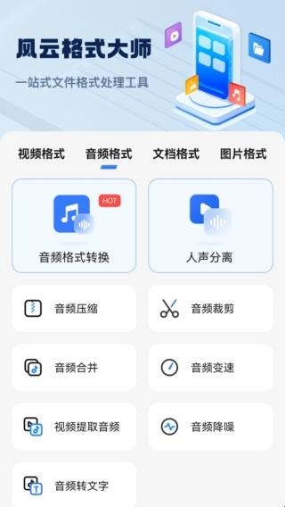 有音频格式转换、人声伴奏分离、音频变速、音频提取等个性化。