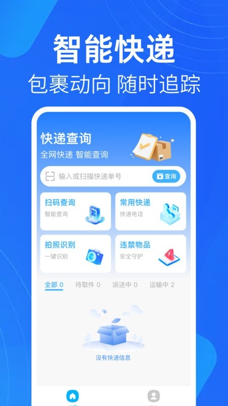 1、首页展示了丰富的快递服务,支持单号和扫码查询功能,轻松知晓派送进度。