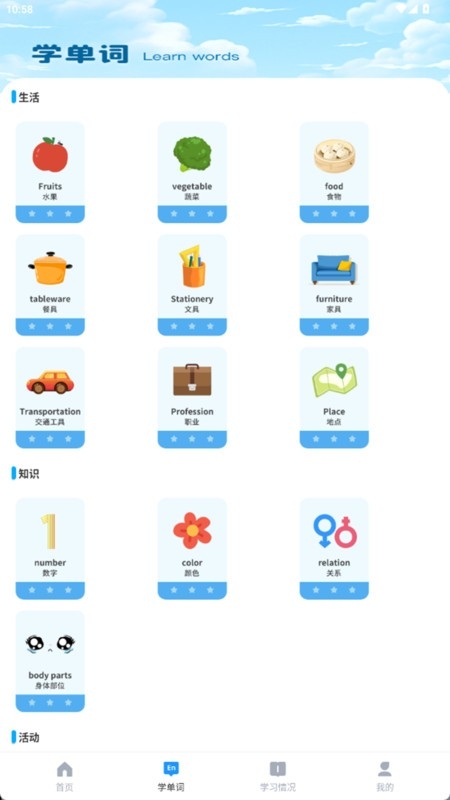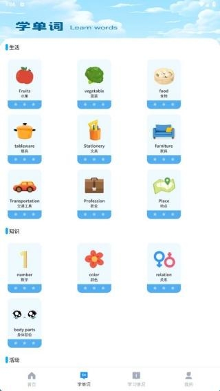 4、在学单词页面,还能了解到动物、水果等对应的单词,轻松背诵。