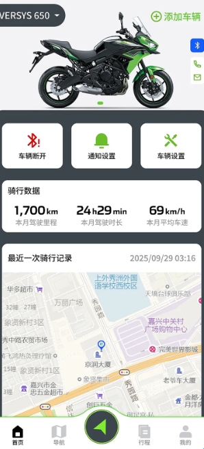 1、添加绑定摩托车将摩托车通过蓝牙连接使用可方便实时追踪记录骑行数据。