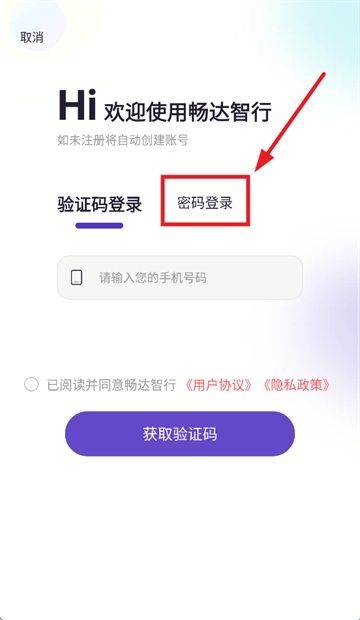 1、密码登录下载安装并打开畅达智行app,进入登录界面后点击密码登录。