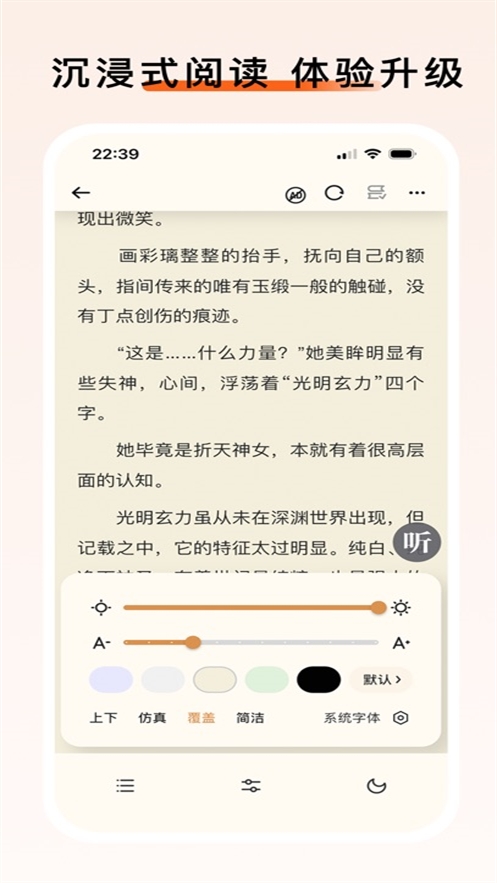 软件提供多种预设主题模板,包括日间、夜间、护眼等模式,并支持自定义背景色板和字体库管理,用户可调整字号、行距、边距等参数。通过亮度自适应调节功能,喵小乐能根据环境光线自动优化显示效果,减少视觉疲劳。此外,软件还具备翻页动画模拟功能,提供滚动、滑动、仿真等多种翻页方式,让阅读更具沉浸感。