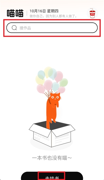 1、打开喵小乐app,进入后点击搜索框或者去找书。