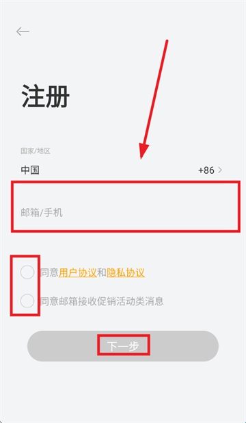 2、输入手机号或邮箱,勾选同意用户协议和隐私协议,同意邮箱接收促销活动类消息,点击下一步获取验证码注册即可。