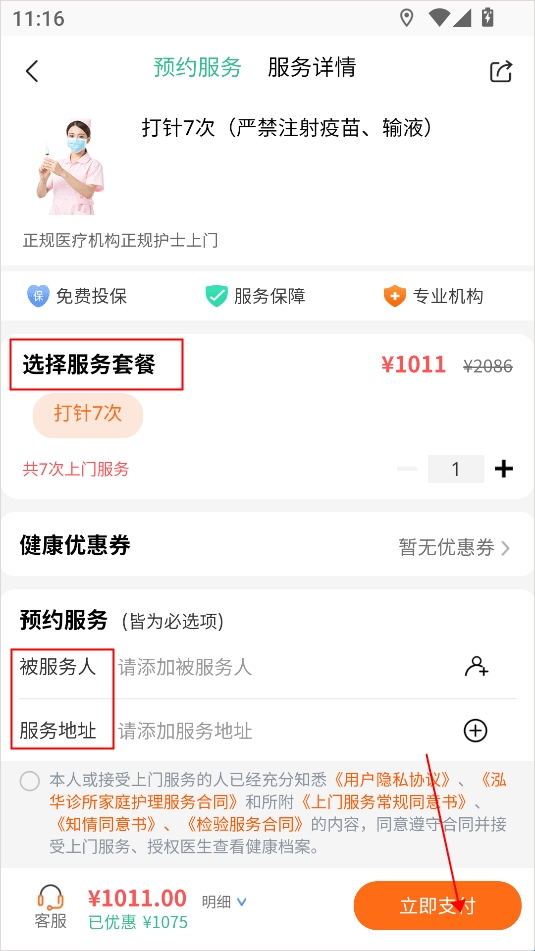 3、进入预约页面后,选择服务套餐、填写服务对象与地址。