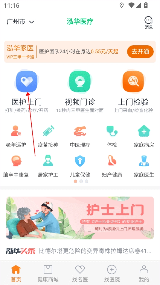 1、打开泓华医疗app首页,点击“医护上门”服务入口。