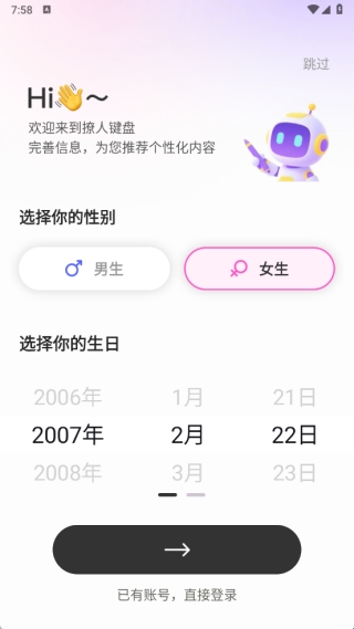 1、打开软件,进入选择你的性别、你的生日,然后进入;