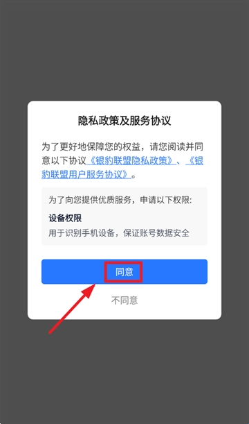 1、下载安装并打开银豹商贸批发app,先同意隐私政策及服务协议。