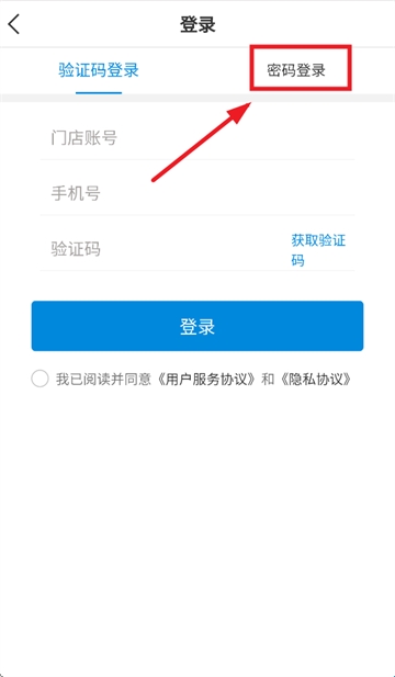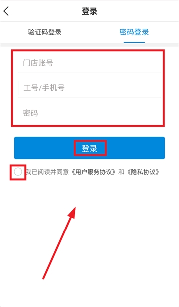 3、输入门店账号,工号/手机号,密码,勾选我已阅读并同意《用户服务协议》和《隐私协议》,点击登录即可。