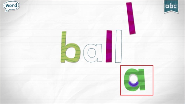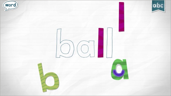 2、点击之后,萌系小怪物们就会把几个字母搬进屏幕,然后你就可以带着你的孩子正是开始英文单词学习喽。把每个字母填进相应的空缺中去,就完成了一个字母的挑战。