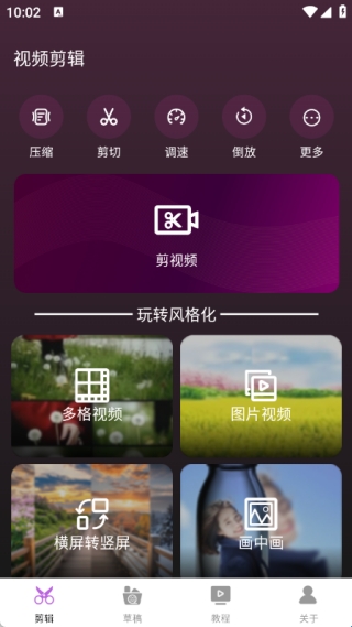 1、在剪辑页面中提供了压缩、剪切、调速以及倒放等功能视频剪辑,同时还有多格视频、图片视频等操作。