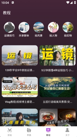 4、在教程页面中提供运镜技巧、共享脚本、拍风景、拍人物、拍实物以及运镜等教程。