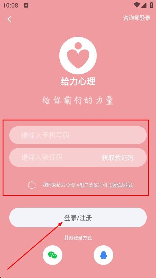 4、在验证码登录页面,输入手机号,填入验证码,勾选同意用户协议和隐私政策,点击登录/注册,即可完成注册。
