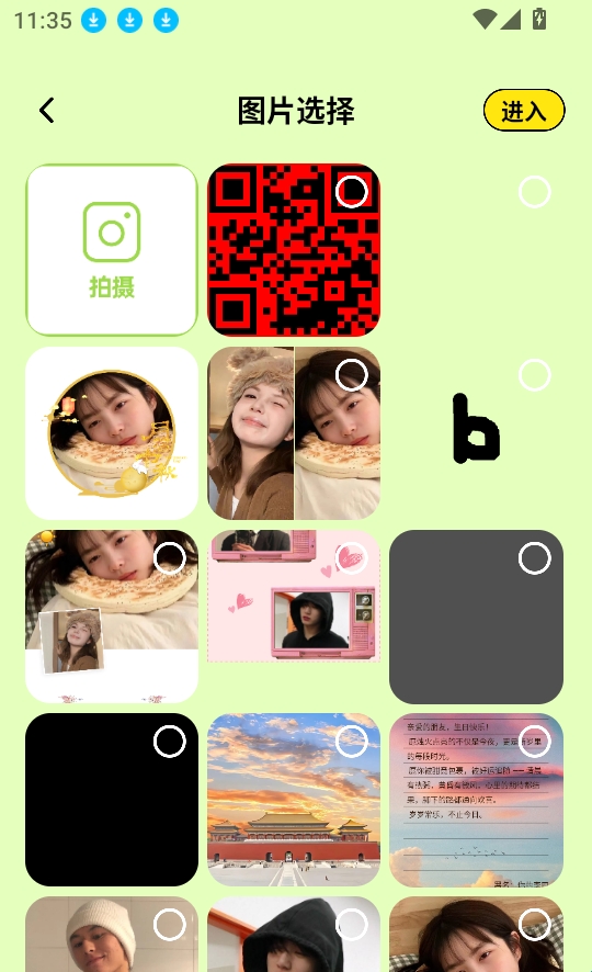 4、然后在自己的本地相册中选择图片,选择需要的图片后点击右上角的“进入”按钮来进行下一步。