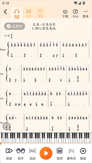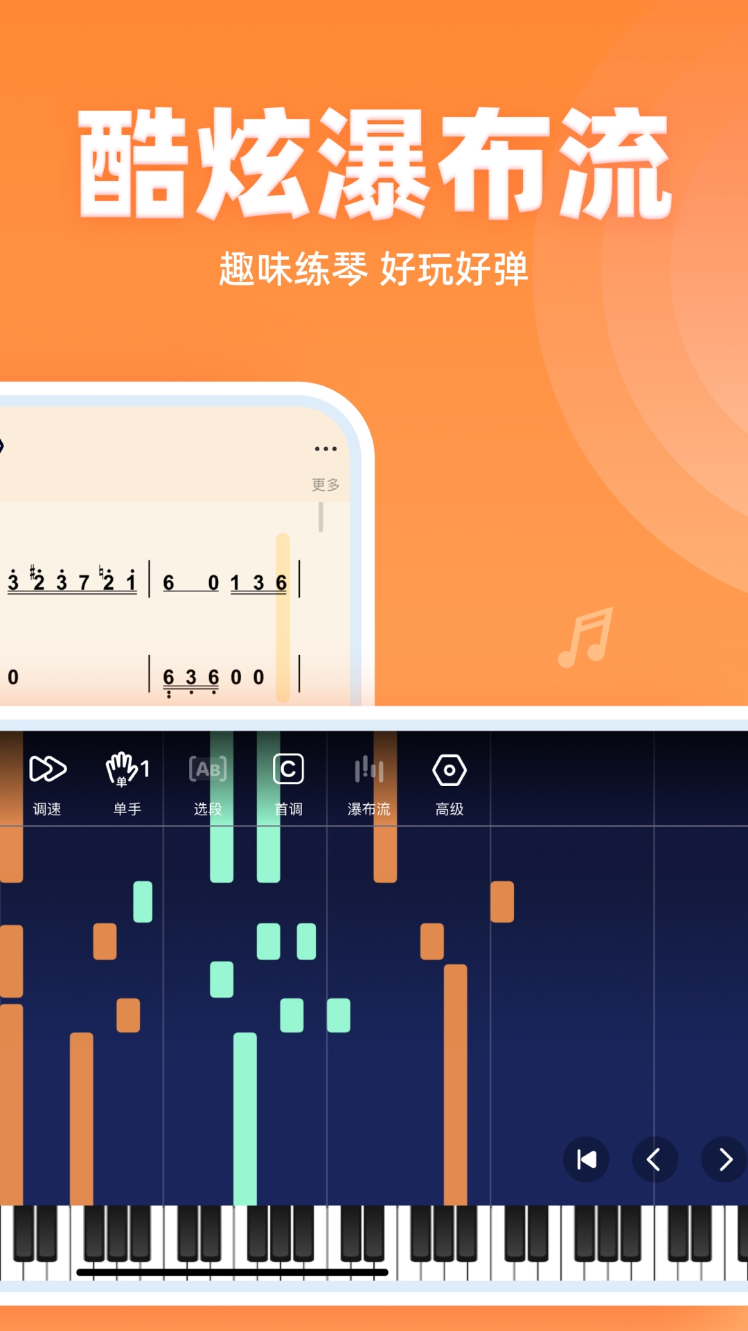 瀑布流动画演示音符下落轨迹,结合游戏化交互设计,让枯燥练习变得生动有趣。