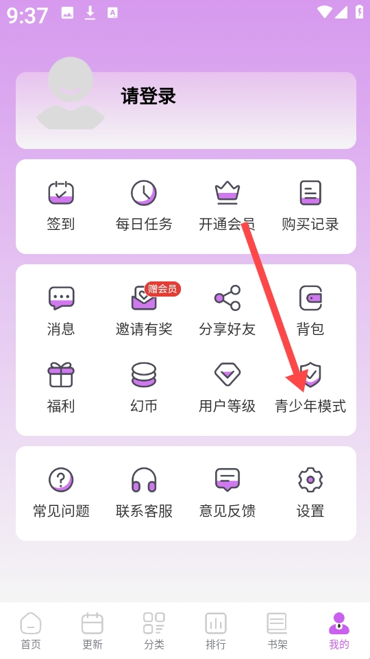 4、点击“我的”,可设置个人信息或开启青少年模式。