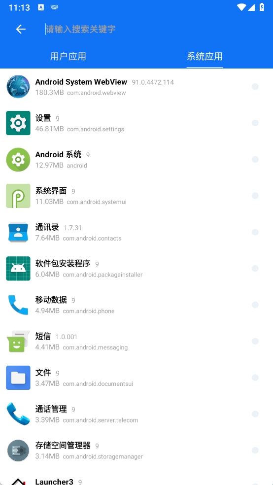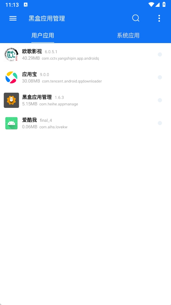 3、轻松浏览手机内所有已安装应用,智能分类为用户应用和系统应用,一目了然。