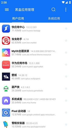 黑盒应用管理是可以帮助用户轻松管理安卓手机中各种应用的一款手机应用管理工具。软件完美兼容多种安卓设备,可以轻松找到手机里面的所有系统和第三方的应用,支持查看版本号、导出应用图标、卸载应用、导出安装包等操作,让你更好的管理手机应用。