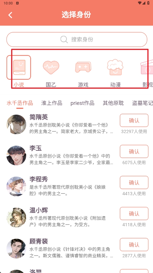 2、根据“小说”“国乙”“动漫”等分类选择喜欢的角色。