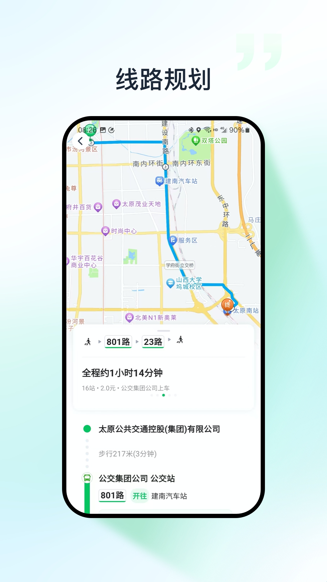 太原公交app顾名思义就是为太远本地居民们打造的智慧公共交通出行服务平台。软件全面覆盖太原市本地所有公交信息,用户们可以根据自己的需求输入始发地和目的地即可快速得到多种公交出行方案,支持一键扫码乘车、到站提醒、线路纠错、站点搜索等多种功能,让你乘坐公交更方便。