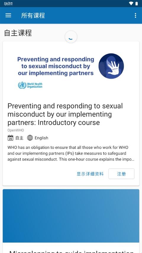 OpenWHO官方中文版是一款由世界卫生组织面向大众打造的全球化卫生应急知识学习平台。软支持多种语言,拥有传染性疾病的管理、疾病爆发及紧急卫生、社会科学干预、传递拯救生命的知识等丰富的医学课程资源,用户们可以在这里学习更多关于疫病治疗方面的知识。