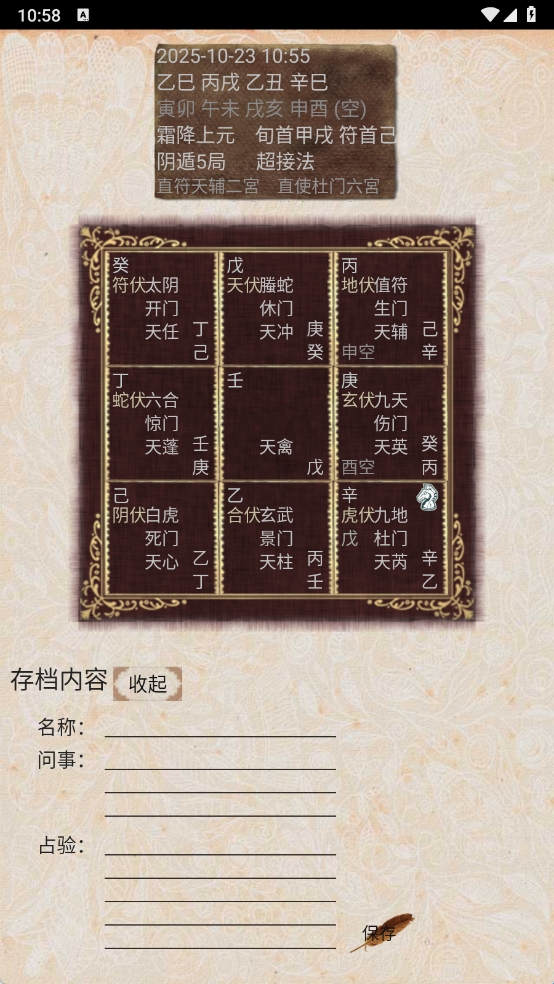 1、奇门排盘:支持手动或自动排盘,根据用户输入的时间(公历/农历)地点等信息,快速生成奇门遁甲盘局,包括九星、八门、八神、三奇六仪等要素的排布,还原传统排盘逻辑。