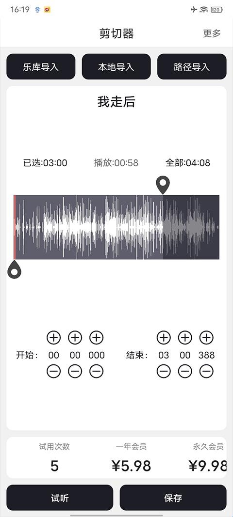 2、导入需要截取的音频,进行玩一番截取操作后点击保存,注意这款软件有5次免费导出的音频的机会,非常划算。