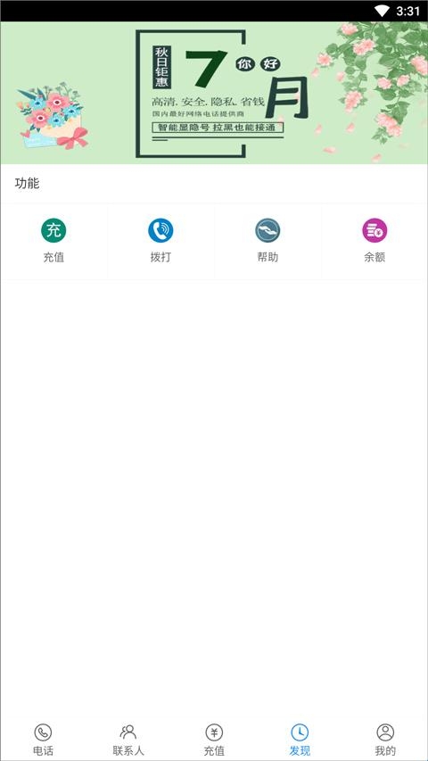 3、点击发现栏,这里有着充值、拨打、帮助、余额等功能服务;
