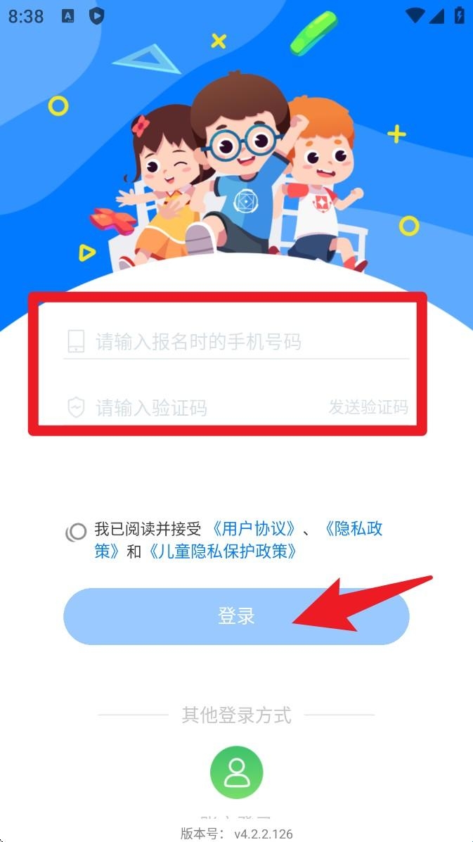 1、打开App后输入报名时的手机号与验证码,勾选协议后点击蓝色按钮完成登录操作。