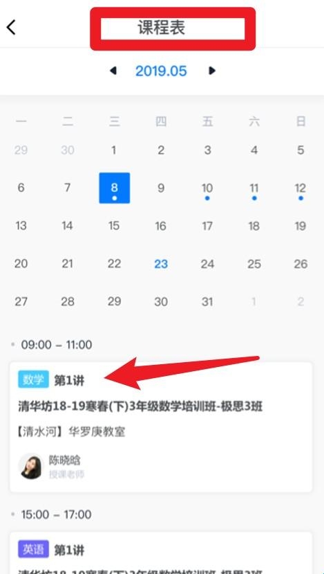 4、切换至“课程表”标签页,可按月份查看课程安排,点选课程卡片还可查看具体时间与科目信息。