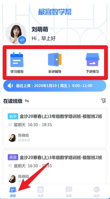 2、登录后进入首页,可查看学习报告、讲义辅导与下讲预习等常用功能,点击底部“课程”进入课程页。