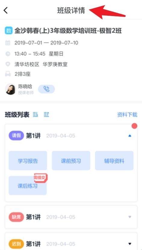 3、在课程页点击班级卡片,可进入“班级详情”页面查看班级时间、地点、老师等详细信息。