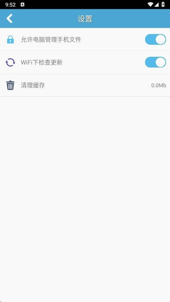 4、点击设置进入设置界面,这里就可以对手机和电脑的文件进行管理,还能清理缓存。