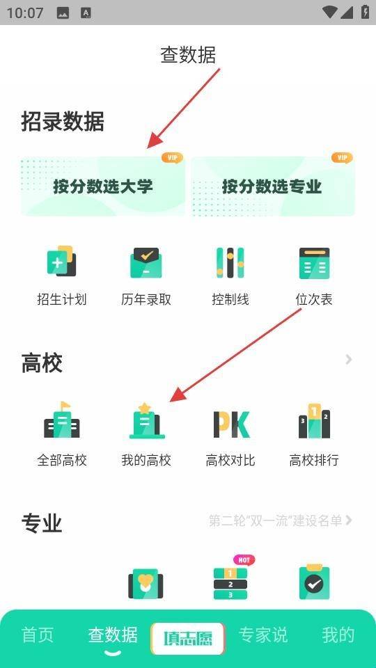 2、切换至查数据界面,利用按分数选大学等招录数据功能,结合招生计划、历年录取等信息,在高校板块管理我的高校,为志愿填报做数据支撑。