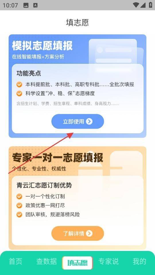3、回到填志愿页,选择模拟志愿填报,点击立即使用,按系统指引,结合全批次填报、冲稳保梯度设置等功能,在线智能填报并分析方案。