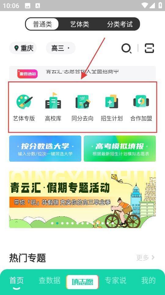 1、打开青云汇手机版,进入填志愿页面,依据考生类型选普通类等分类,定位所在地区、年级,通过艺体专版、高校库等功能入口,初步筛选志愿相关信息。