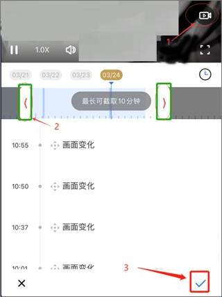 查看云回放时,点击回放画面右侧的“摄影机”图标进行录制,在时间刻度条中,可以选择需要下载的录像。点击右下角确认下载即可。下载完成后,保存至App“相册”/手机相册。