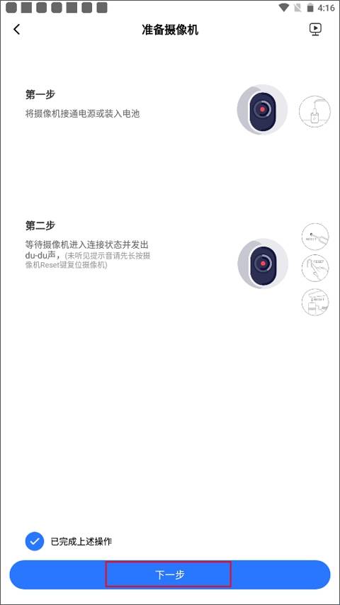 4、这时app提示你需要先准备摄像机,做好这个前提工作之后,点击下一步。
