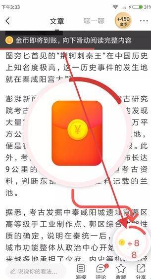 1、进入文章页,下滑阅读内容,触发金币奖励,点击领取,积累阅读收益。