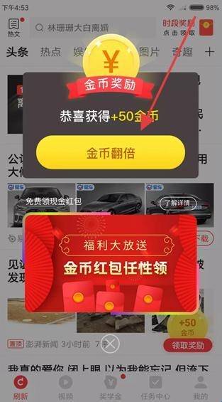 2、在资讯页,完成时段奖励,点击翻倍,参与福利活动,领取金币红包。