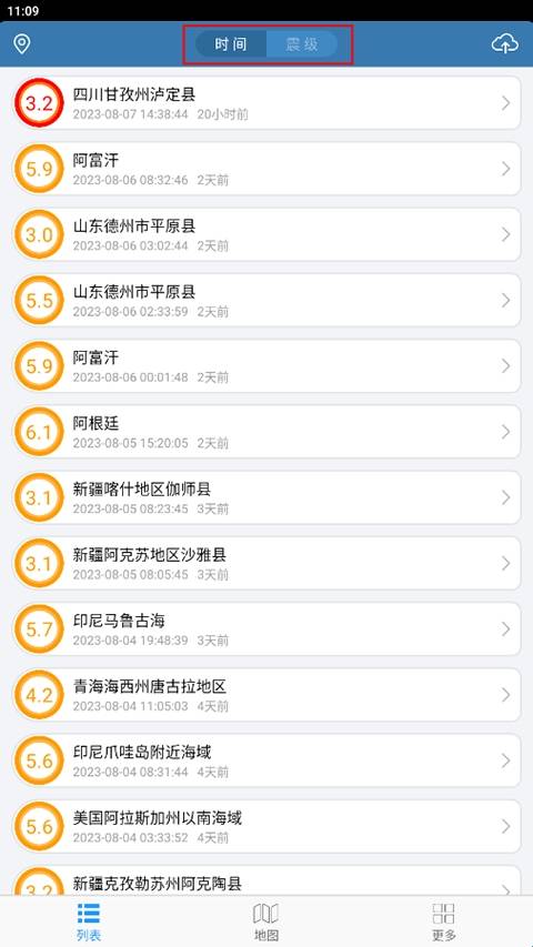 1、在“列表”页面,找到想要看信息的地区,可以根据时间和震级查找。