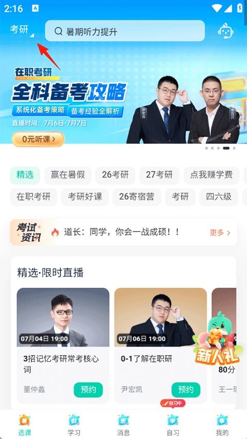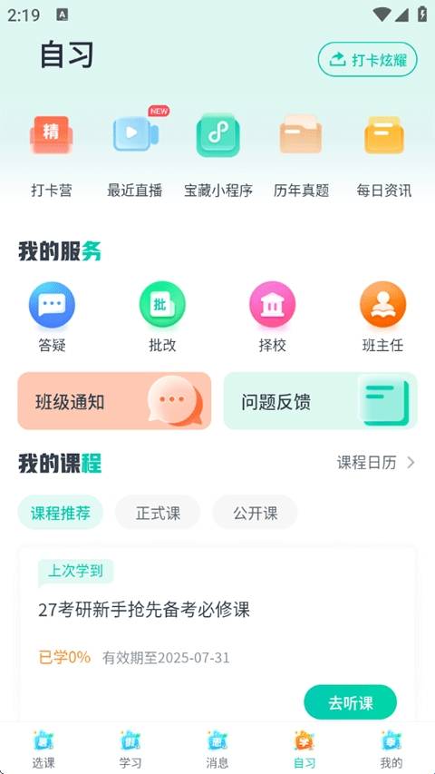 7、自习功能页:用户可以在这里打卡、做真题、选择学校、自习等,功能非常全面;